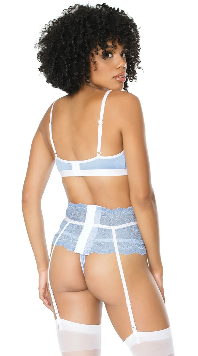 You’ll have the most soothing sexual encounter in this enticing two-tone bralette set featuring sheer mesh triangle cups with strappy bust detailing, adjustable shoulder straps, a hook and eye back closure, a matching high waisted garter belt with contrast adjustable garters, and a matching panty. (Stockings not included.)