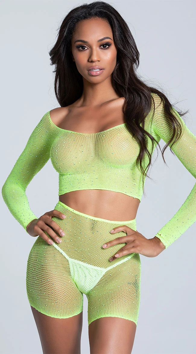 Embrace the trend with these stunning mesh biker short set featuring a mesh crop top with a wide neckline, 3/4 sleeves, rhinestone accents, and matching mesh biker shorts with a high waist, and a mid thigh length. (Bra and panty not included.)