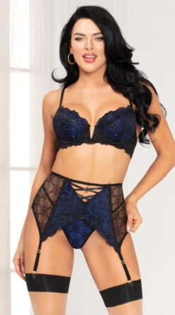 Let your beauty shine in this gorgeous bra set featuring molded underwire cups with a pretty lace overlay, a notched V-neckline, adjustable spaghetti straps with gold hardware, a hook and eye back closure, a matching lace garter belt with criss-cross details, lace sides, hook and eye back closures, adjustable garter straps, and a matching thong panty. (Stockings not included.)