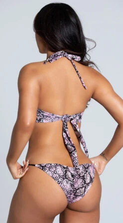 Have fun in the sun in this exclusive monokini swimsuit featuring a halter strap with a criss-cross back, horizontal stripes, a center bodice panel with open sides, a tie back closure, a thick strappy bottom, and a cheeky cut back.